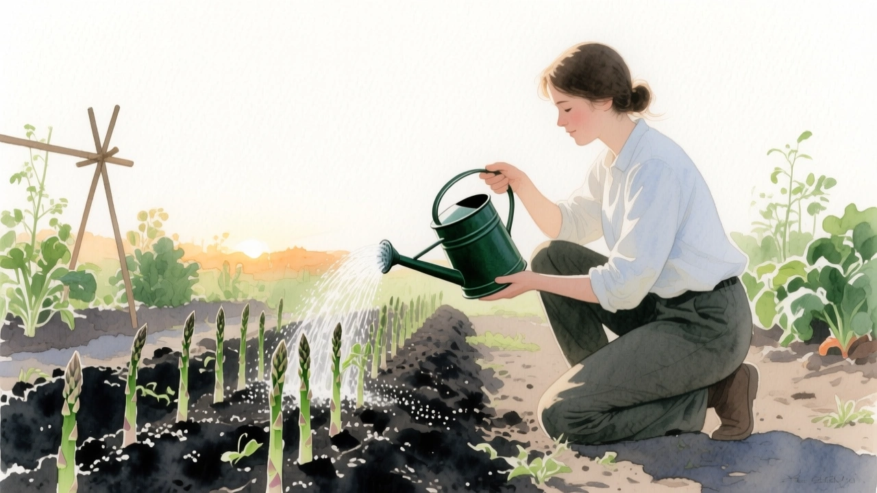 Sparris är hungrig. Ge guldvatten eller nässelvatten fram till midsommar för att ge plantan kraft att bilda nästa års skott.