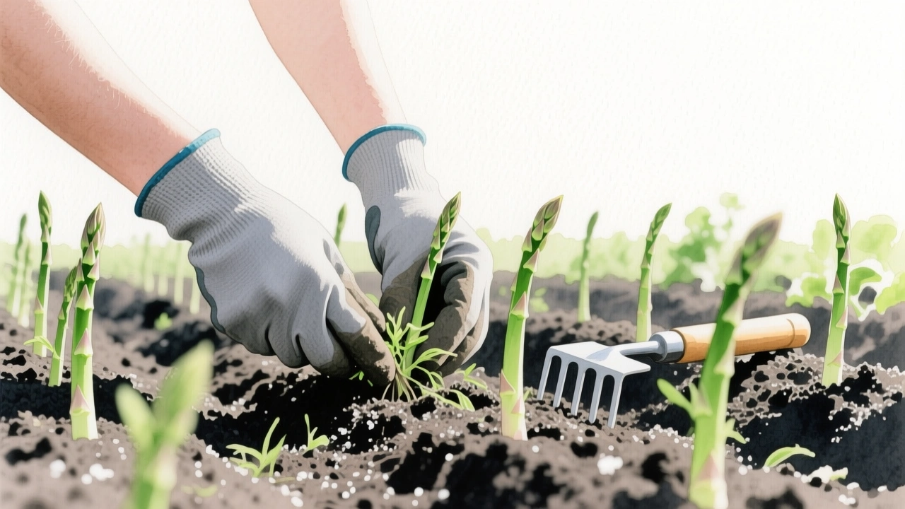 Sparris tål inte konkurrens, särskilt inte från rotogräs som kvickrot. Rensa regelbundet och var försiktig så du inte skadar de ytliga rötterna.